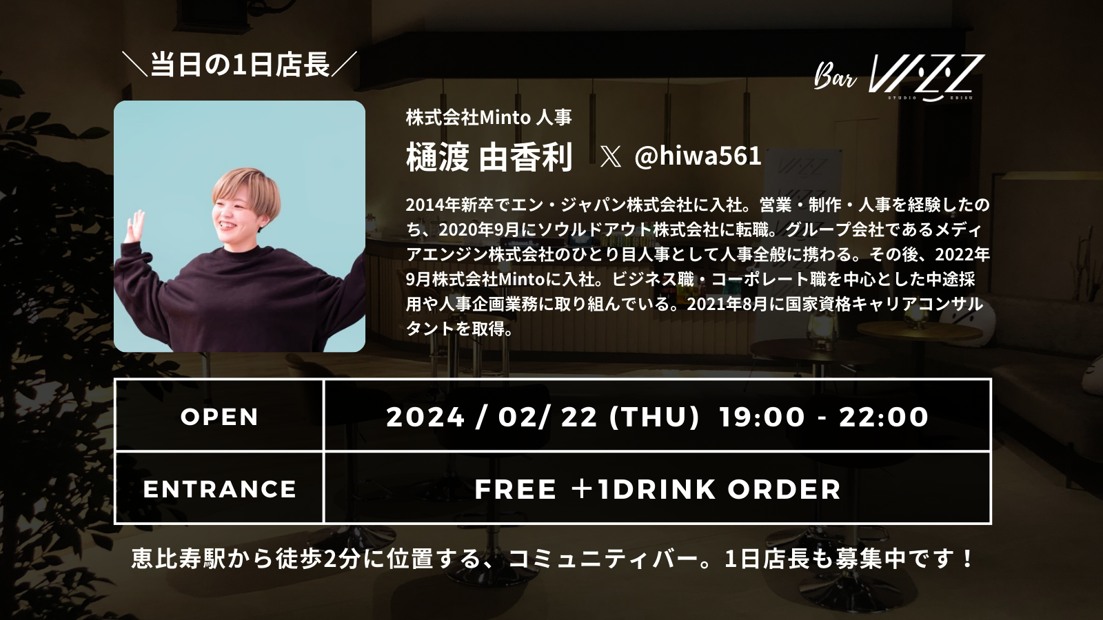 そして、プレオープン第5弾となる2月22日(木)のBar VIZZは、株式会社Mintoにて人事を務める、樋渡 由香利(ひわたし ゆかり)さんが1日店長を務めます!