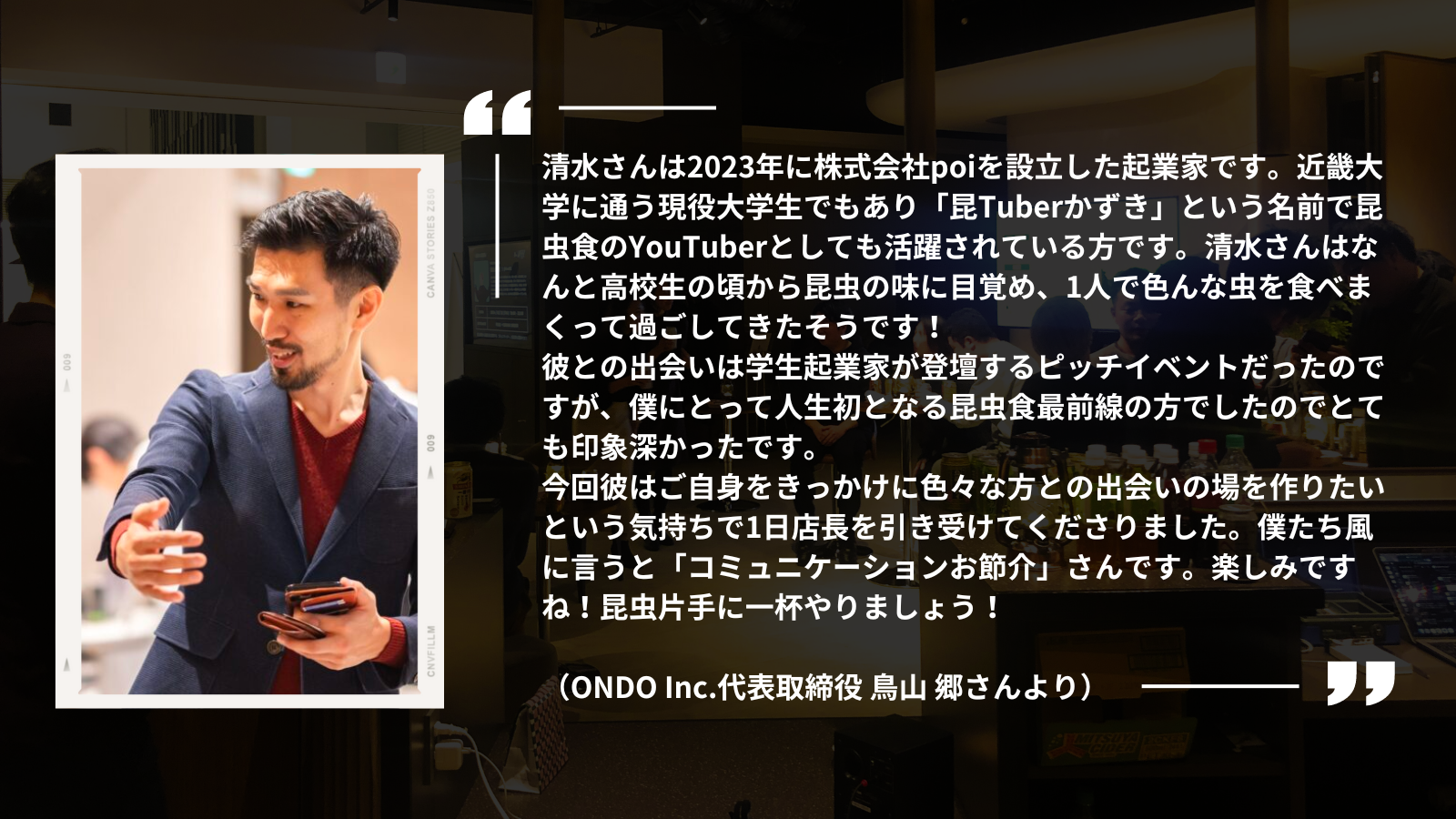 そして、3月28日(木)は、近畿大学発ベンチャー・株式会社POI代表取締役を務め、「昆Tuber」としても活躍する清水 和輝さん(@kazuki_mushi)が1日店長を務めます。清水さんが開発されている昆虫食を試せるのはもちろん、参加者の皆様に5分ほどずつ自己紹介いただける場も設けます(※希望者のみ)ので、ぜひお気軽にご参加ください^^