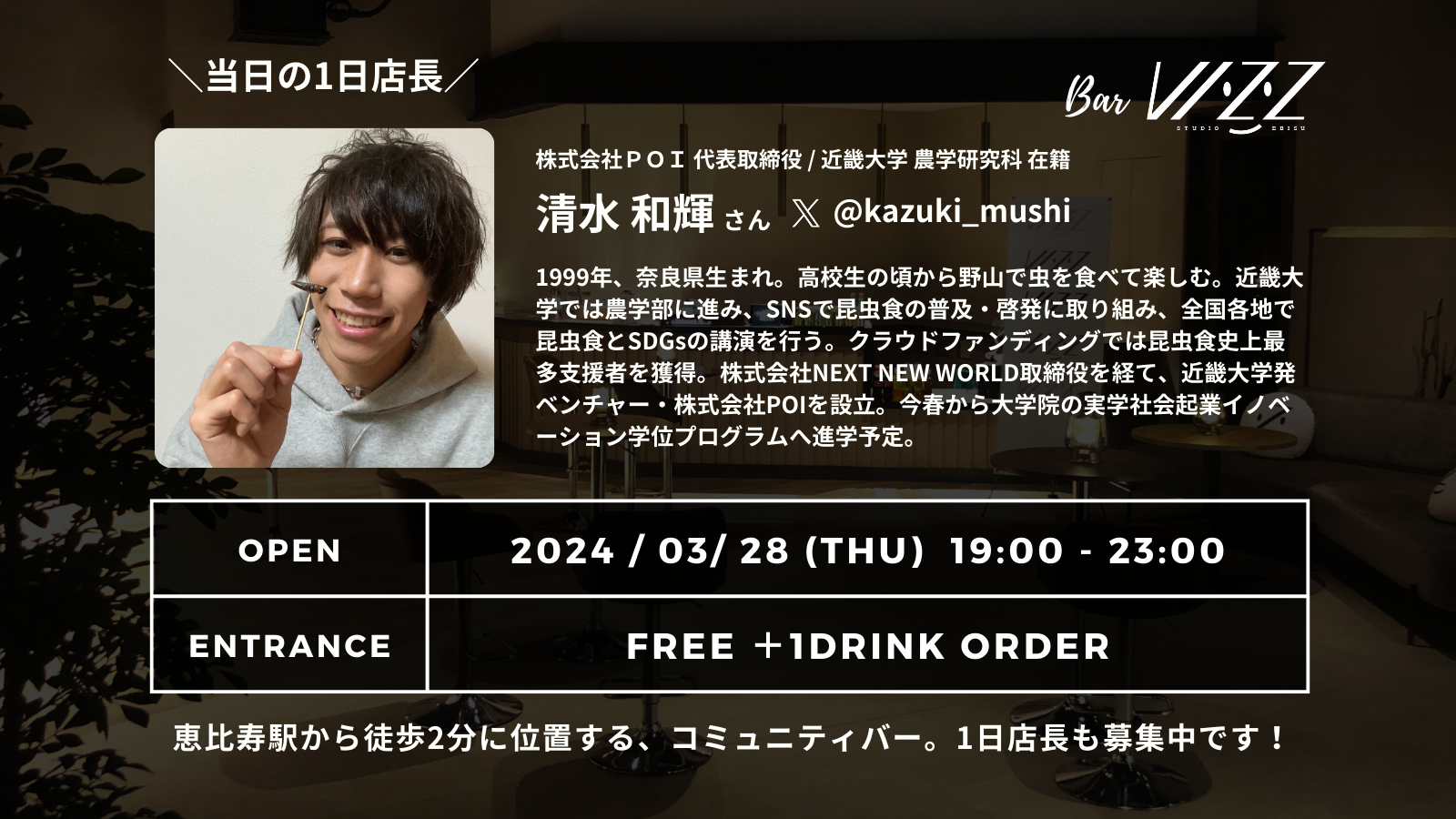 【3月28日(木)】Bar VIZZ 〜昆Tuberの清水 和輝さんが1日店長を務めます〜
