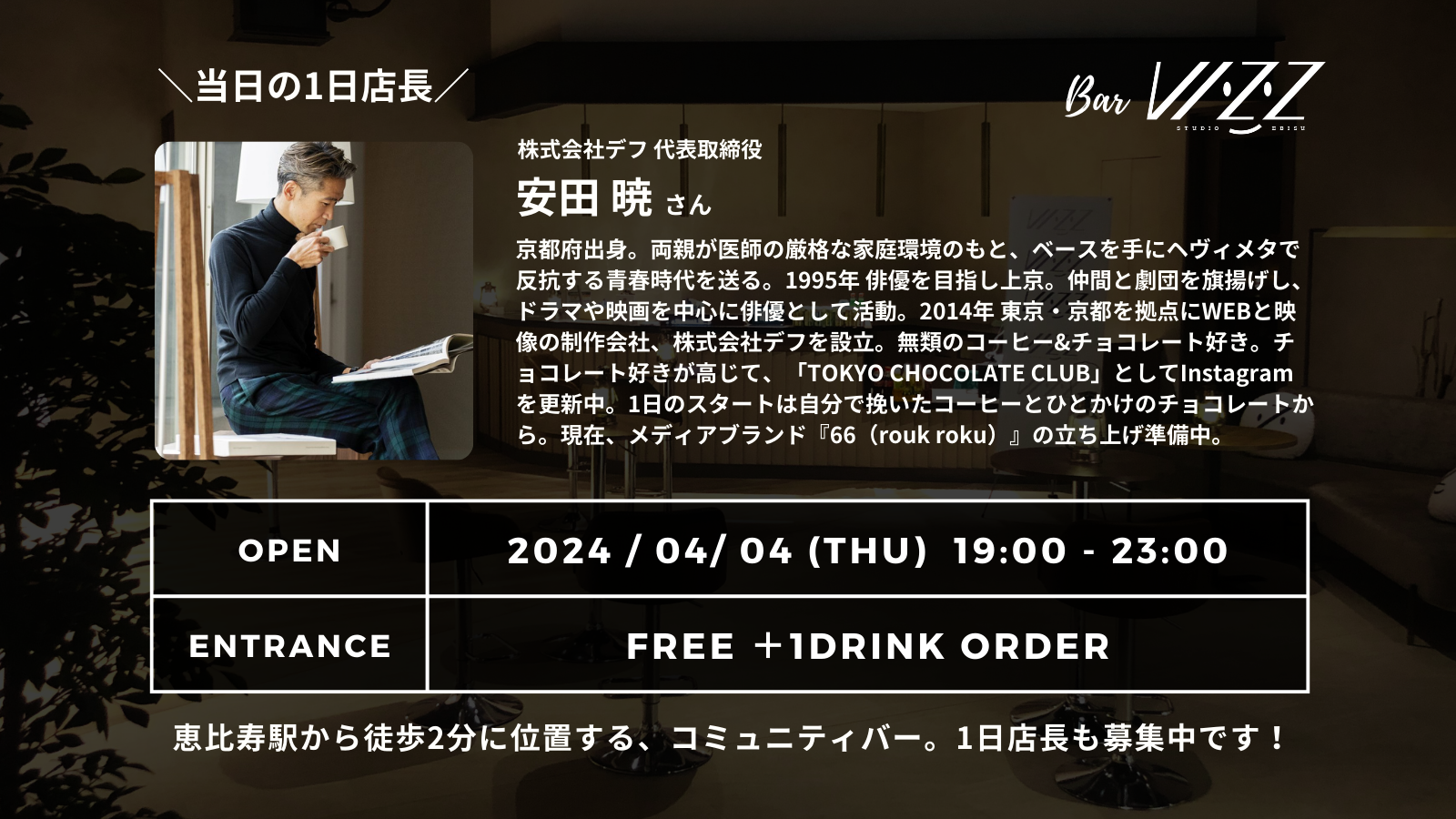 【4月4日(木)】Bar VIZZ 〜株式会社デフ代表取締役 安田 暁さんが1日店長を務めます〜