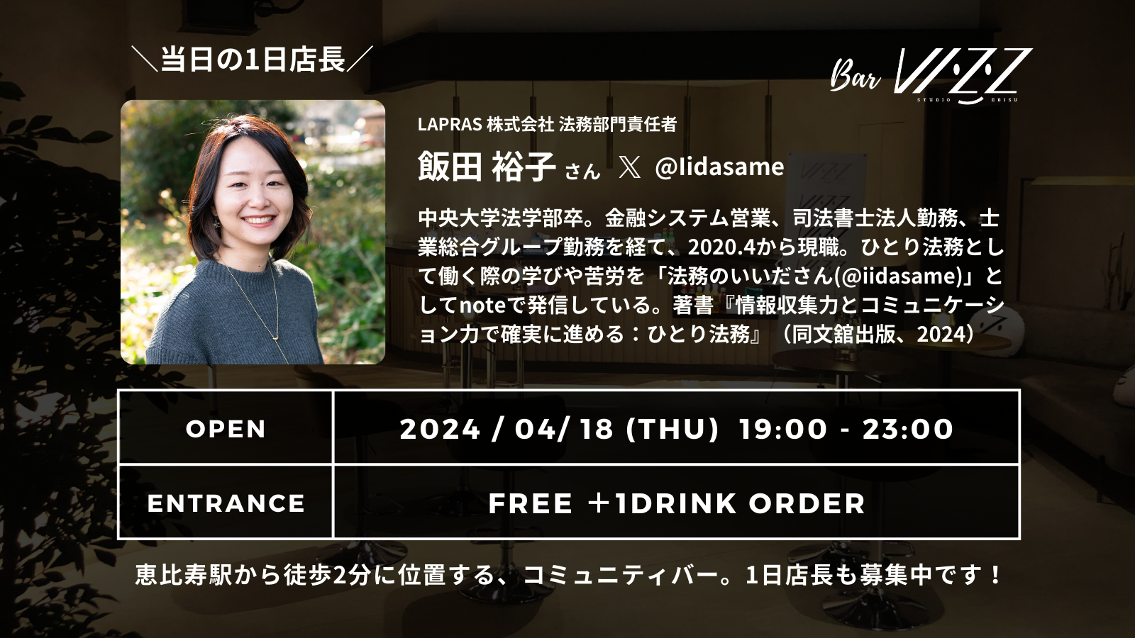 【4月18日(木)】Bar VIZZ 〜LAPRAS社 の「法務のいいださん」こと飯田裕子さんが1日店長を務めます〜