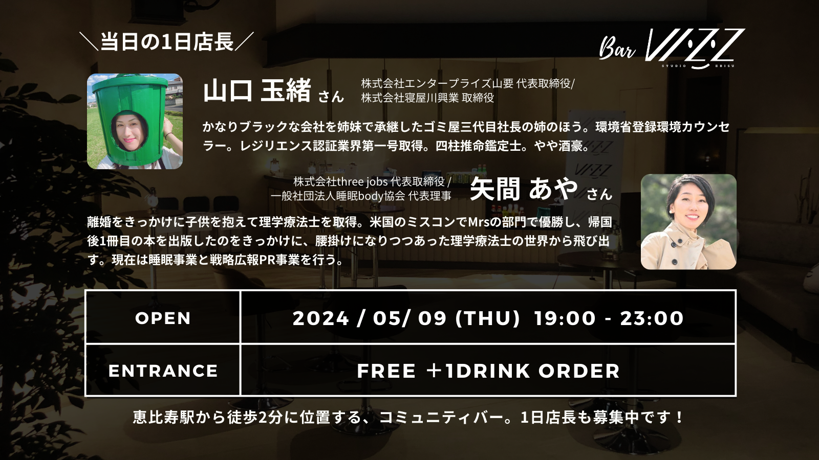 【5月9日(木)】Bar VIZZ 〜エンタープライズ山要社代表 山口玉緒さんと、three jobs社代表の矢間あやさんが1日店長を務めます〜