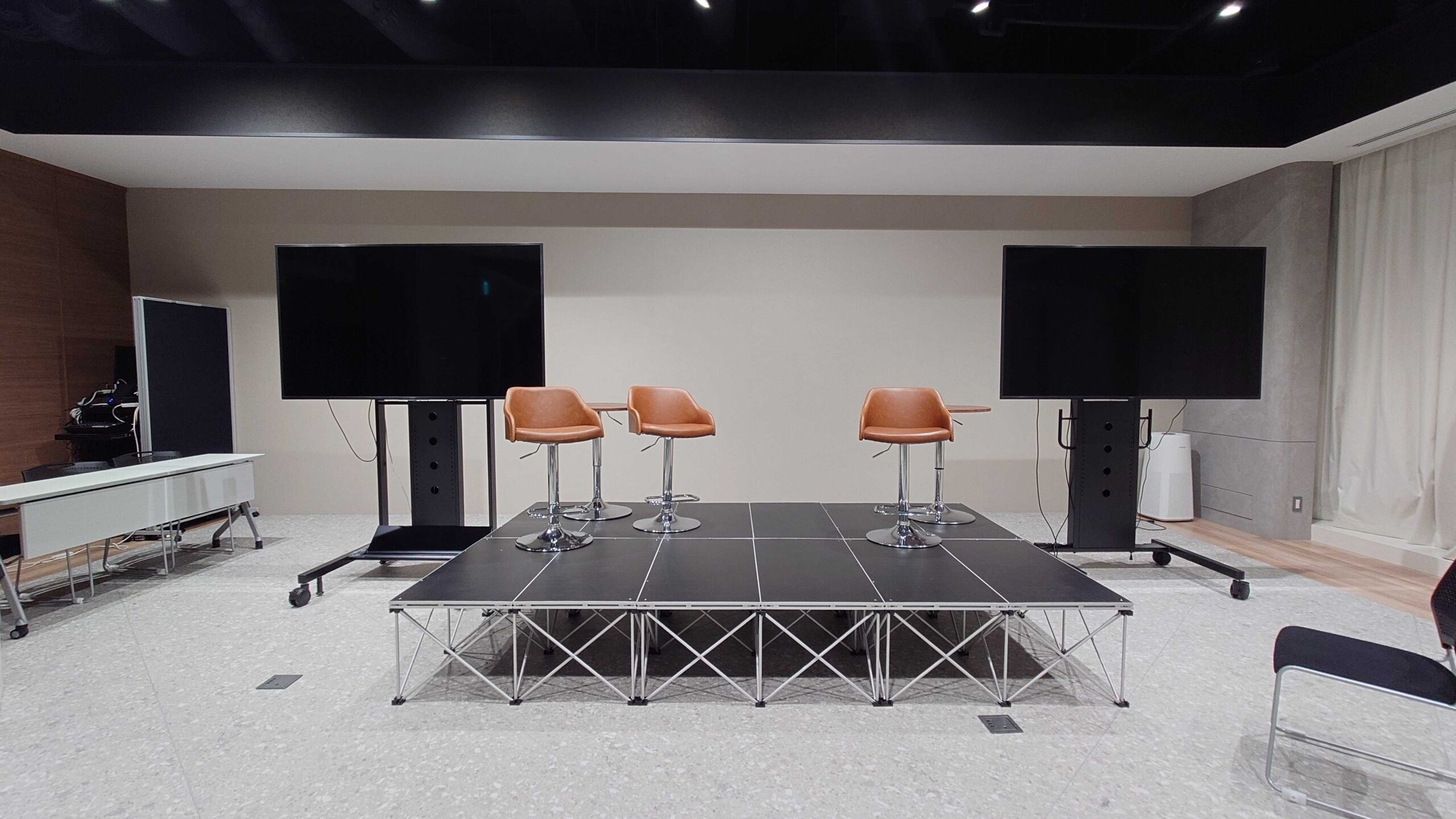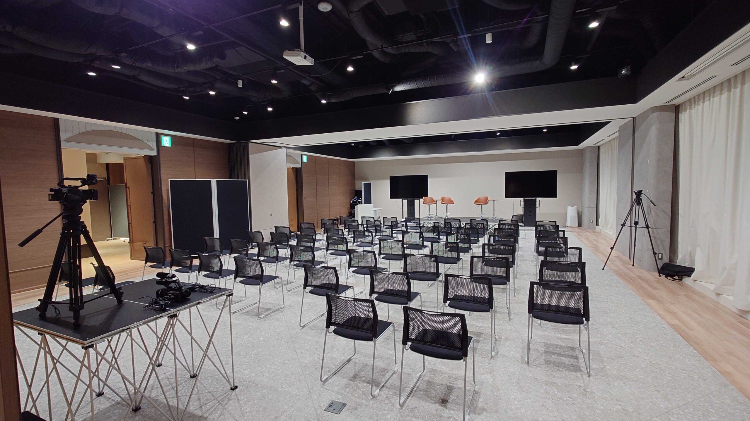 業績発表会 [STUDIO-1+2]利用用途:社外向け業績発表会(配信形式) 使用機材:スタッキングチェア、ハイチェア、ステージ、大型モニター、カメラや音響などの配信機材 人数:50名他の事例を見るStudio STUDIO-1VIEW MORE STUDIO-2VIEW MORE STUDIO-3VIEW MORE STUDIO-1+2VIEW MORE LoungeVIEW MORE Waiting RoomVIEW MORE FoyerVIEW MORE KitchenVIEW MORE TerraceVIEW MORE フロアマップ 料金表 無料レンタル機材一覧